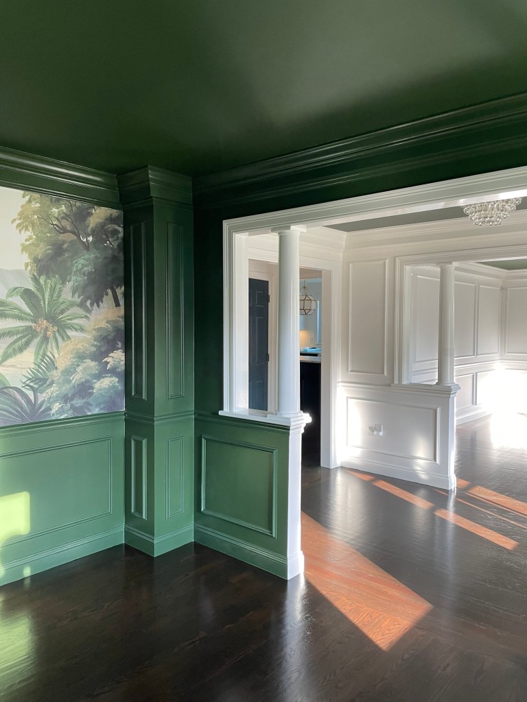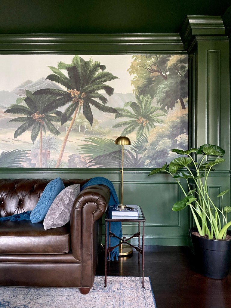 During the day as the light streams in, the room transports you to a place far away. Whereas at night, you find yourself floating thru conversations while enjoying an Old Fashioned. I was inspired by my Kerala (India) roots mixed with a nod to British Colonial style. I added native plants and molding detail to frame the existing wall mural and make the space come to life.